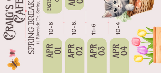 Visit Craig's Cat Cafe—where coffee and cats create a cozy escape. Enjoy freshly brewed coffee and baked goods while snuggling with adorable rescue kittens. A perfect spot to unwind, connect, and make new furry friends.